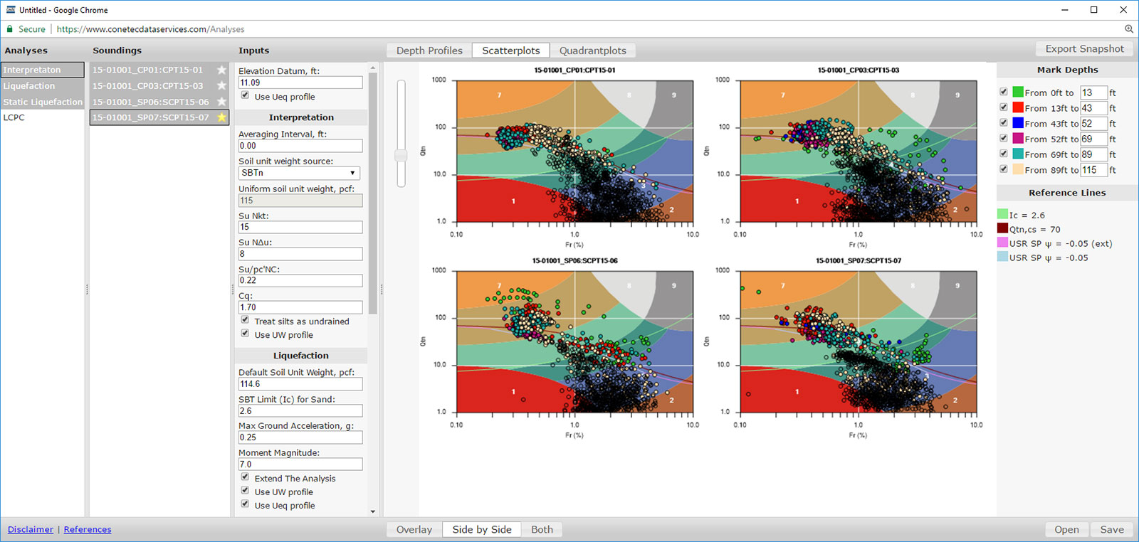 - Análisis de licuación cíclica y estática y un largo rango de parámetros de CPT calculados