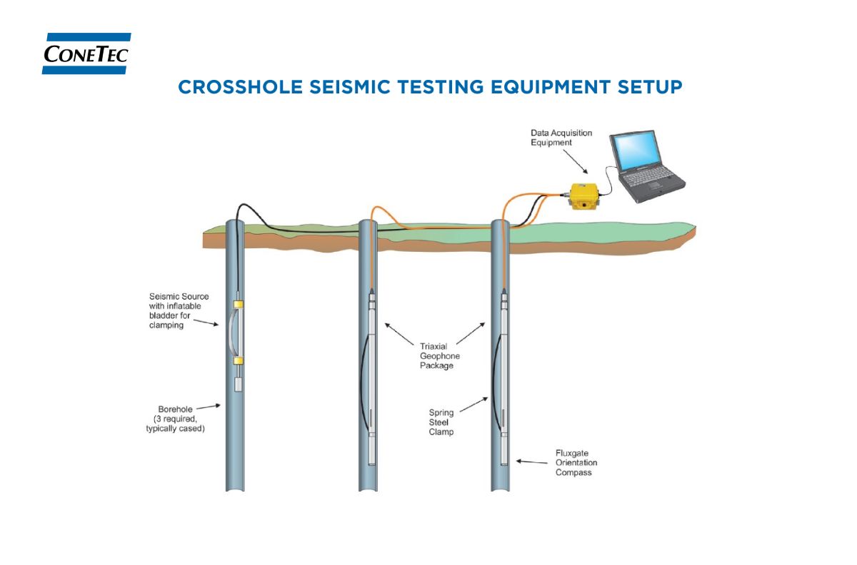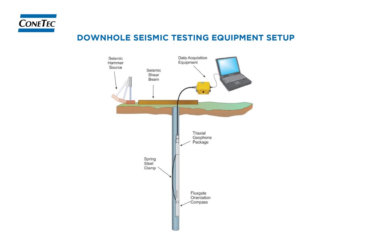ConeTec effectue des essais sismiques de type downhole (DST) et des essais sismiques de type crosshole (CST) depuis plus de 30 ans. Ces essais sont utilisés pour obtenir des vitesses de cisaillement et de compression dans un trou de forage pour diverses applications géotechniques.