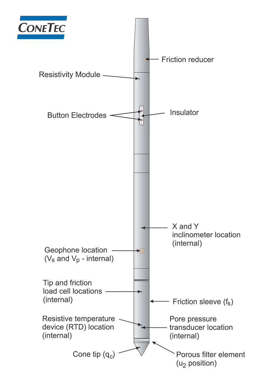 The resistivity/conductivity cone penetration test (RCPTu) combines the downhole measurement of soil resistivity/conductivity and the logging capabilities of the cone penetration test (CPTu or SCPTu). The RCPTu provides a rapid, reliable, and economic means of determining soil properties in addition to providing relative measurements of electrical resistivity/conductivity.