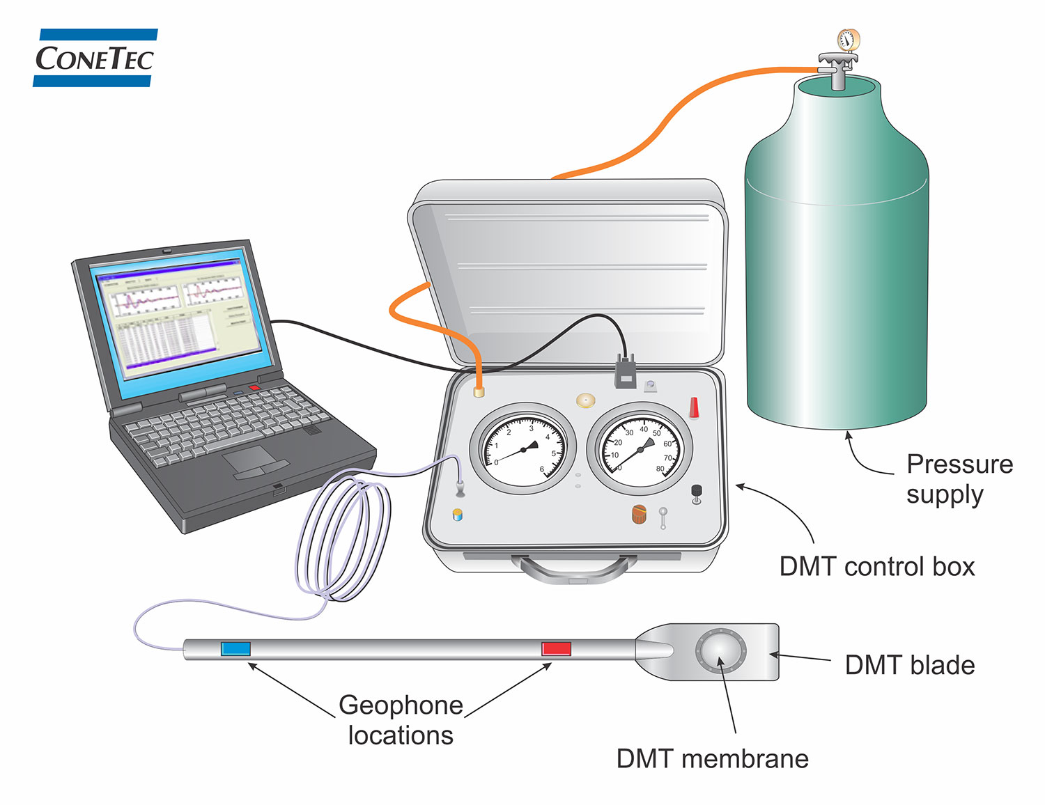 Control box includes high resolution pressure gauge (0.05 bar inc.) for softer soils and high pressure gauge (60 bar max.) for denser soils